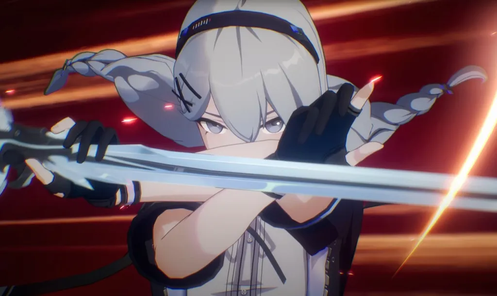 Zero character from Neverness to Everness wielding a sword in an action combat scene. Role:All-rounder / Balanced fighter