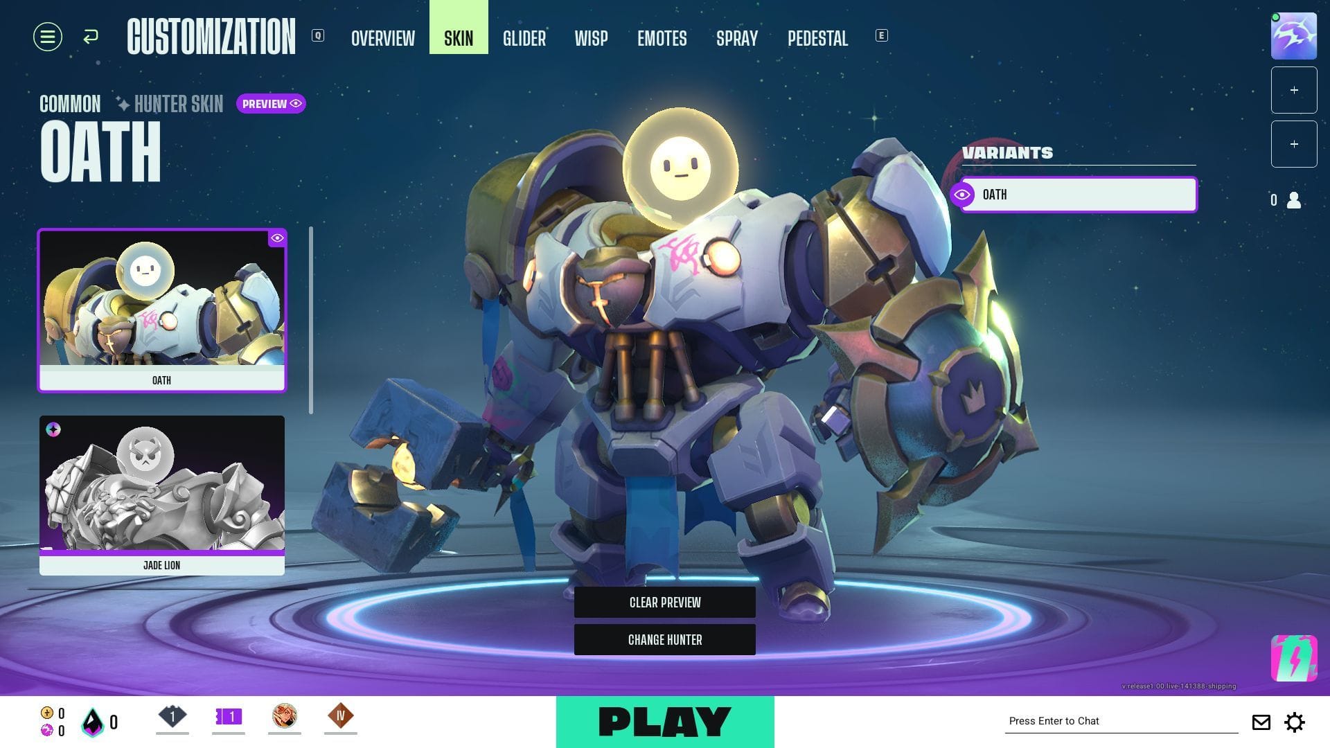 Game customization screen showing armored robot skin preview Oath is the easiest S-tier pick to defend because his value is visible even to someone who has never read a single old meta thread.