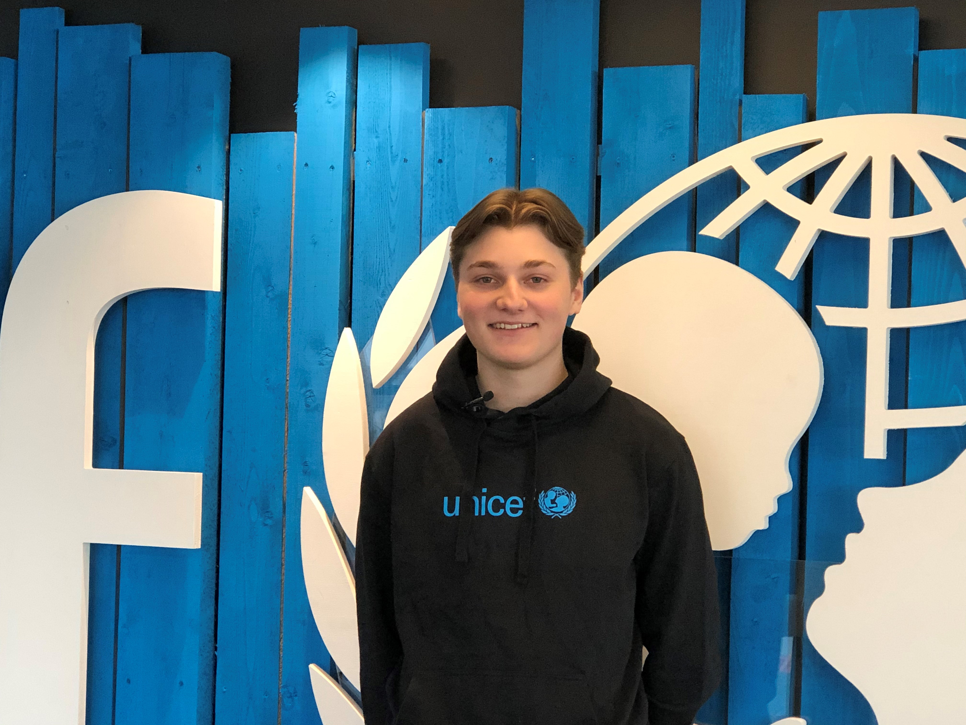 Smiling young person standing before UNICEF logo wall Total Earnings: ~$1,540,000