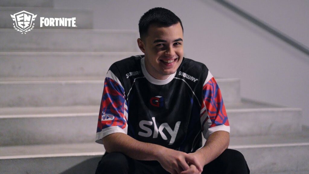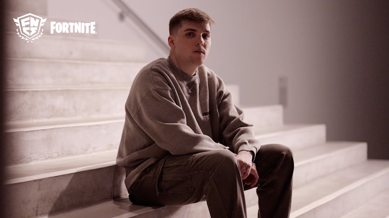 Smiling esports player wearing Fortnite jersey on stairs Total Earnings: ~$1,660,000