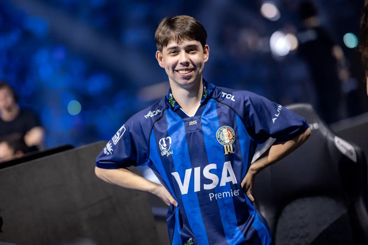 Smiling esports player wearing blue jersey on stage Total Earnings: ~$920,000