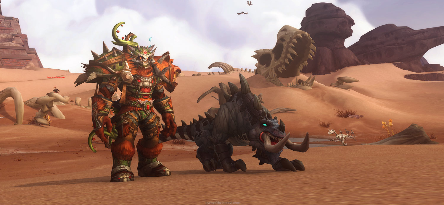 Beast Mastery Hunter character from World of Warcraft standing with a large armored beast companion in a desert environment. BM is still a comfort spec and a strong choice for many players, but high-end metas often punish low ceilings.