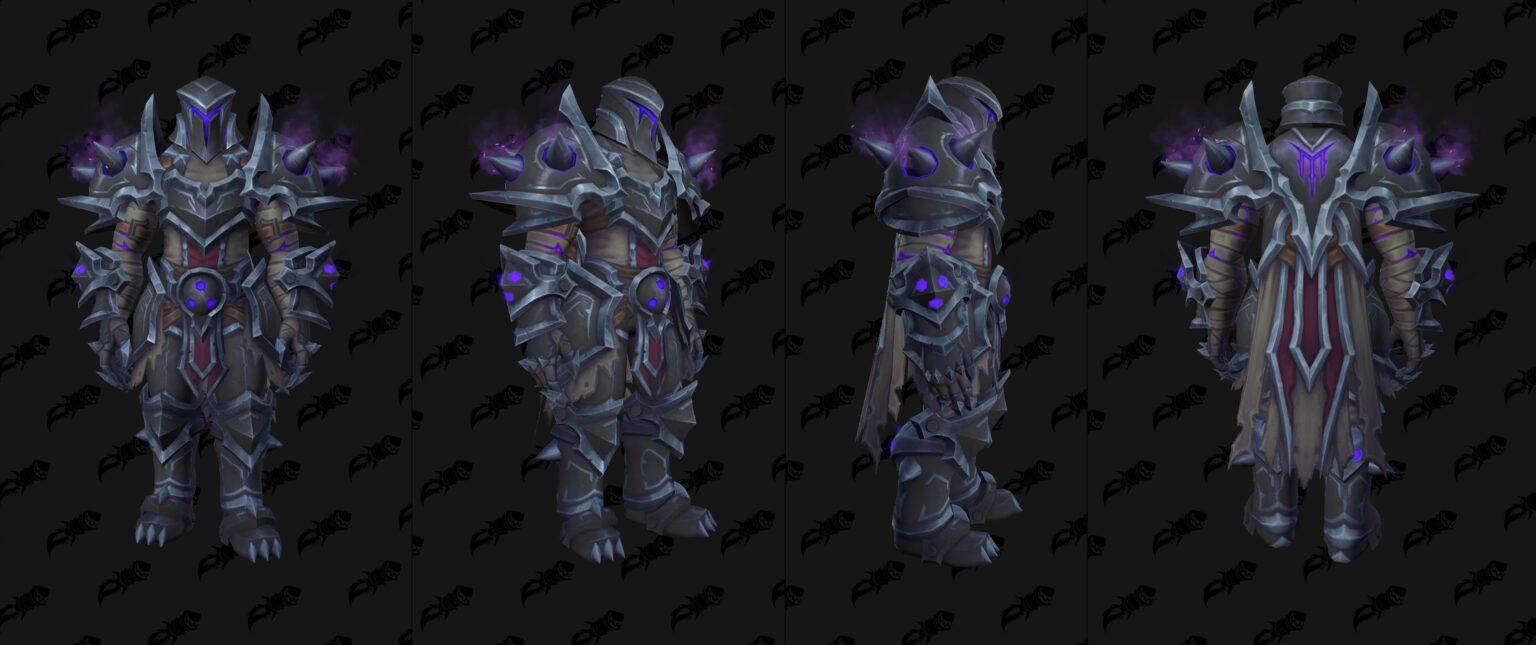 Fury Warrior armor set from World of Warcraft shown in front, side, and back views with dark plate armor and glowing purple accents. Fury often looks great in short windows and feels strong to play, but it can struggle to keep pace with top meta scaling and utility packages.