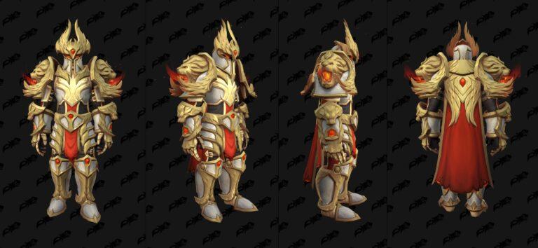 Retribution Paladin armor set from World of Warcraft shown in front, side, and back views with golden holy-themed plate armor. Ret is still fantastic for many players, but in high-end throughput metas it can trail the top options. This is a common split between “PUG power” and “leaderboard power.”