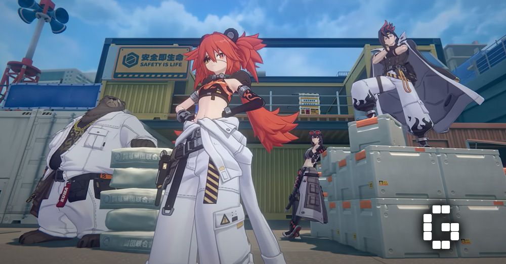 Four anime-style characters stand in a stylized urban setting with shipping containers and a "SAFETY IS LIFE" sign