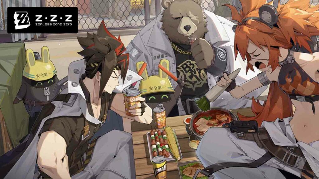 Characters from Zenless Zone Zero gathered around a table with various food items and drinks, showcasing their unique designs and interactions